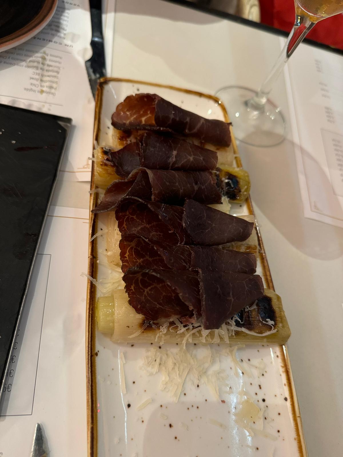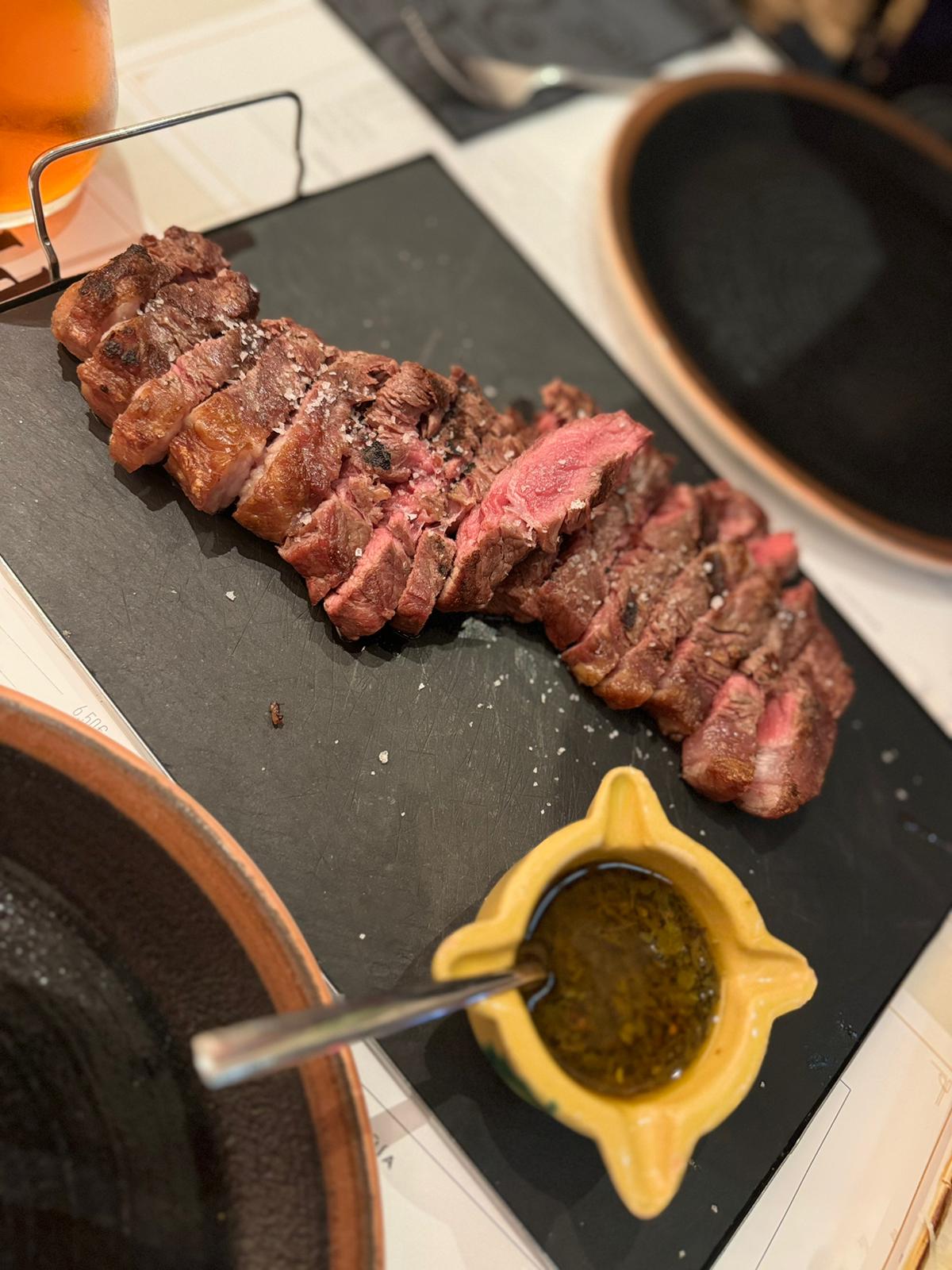 En los platos principales, el New York Steak, aunque de buen sabor, resultó algo correoso a pesar de haber pedido un punto poco hecho. Los puerros a la brasa fueron el plato más decepcionante: aunque la cecina que los acompañaba era exquisita, el puerro en sí se volvía pesado después de algunos bocados y se echó en falta un acompañamiento que equilibrara mejor el plato. Además, el queso fundido sobre el puerro no estaba fundido, lo que afectó negativamente la textura y el sabor.