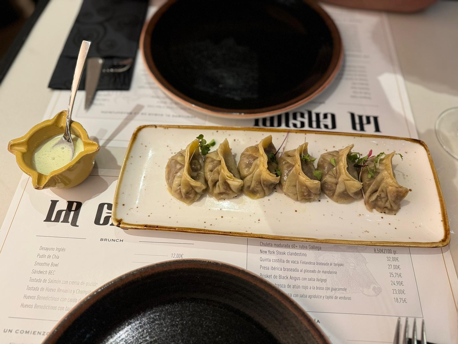 Los entrantes de la noche fueron una mezcla de curiosidades y decepciones. Las gyozas de cordero con yogurt de menta fueron el plato más interesante y creativo de la velada. La combinación de cordero con la frescura del yogurt de menta prometía una experiencia exótica. Sin embargo, la textura del cordero resultó ser algo seca, lo que restó parte del disfrute y la riqueza esperada de este plato. A pesar del esfuerzo en la presentación, el relleno no logró mantener la jugosidad que caracteriza a una buena gyoza, lo que hizo que el plato no cumpliera completamente con sus promesas de sabor.